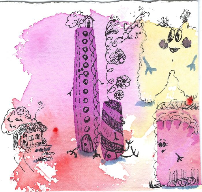 Obsessed with my travel memories in France; these funny creatures sat right down for a portrait. Boxy yellow figure watches from the cloud realm. Original watercolor 3.5″ x 3.25″ ish.
